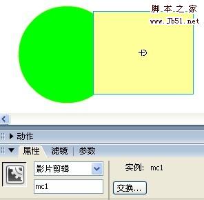 這樣,給方形影片剪輯命名為mc1,給圓形影片剪輯命名為mc2。