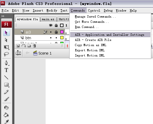 到現在我們的窗體還會顯示標題欄,的以我們還要對窗體進行地一下配置,選擇Commands->AIR -Application and Istaller Settings,如下圖所示: