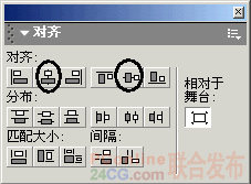 3、回到主場景,按快捷鍵Ctrl L打開“庫”面板,把“庫“中的“影片”元件拖放到場景1中。點選場景1中的“影片”元件,按快捷鍵Ctrl K打開“對齊”面板,點選“相對與舞臺”按鈕,然后再點擊“水平對齊”和“垂直對齊”兩個按鈕(如圖3所示),使影片“元件”在居中于場景內。