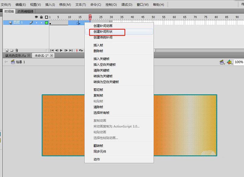 6、在時間軸的第1關鍵幀與第15關鍵幀之間右鍵鼠標,選擇創建補間形狀,第15幀與第30幀之間也是創建補間形狀。