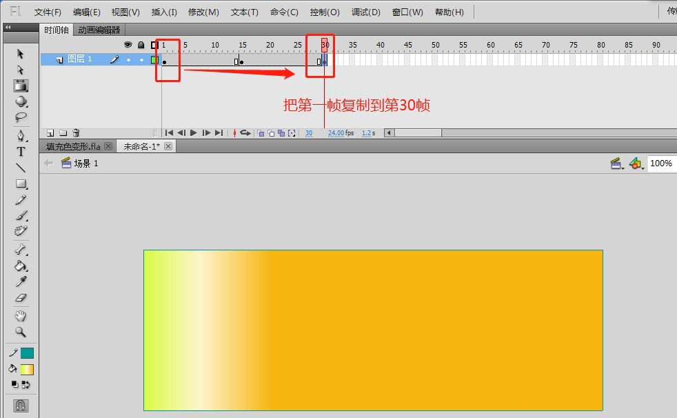 5、將時間軸第1幀進行復制,然后在第30幀處進行粘貼第1幀。