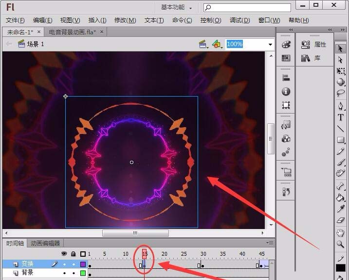 7、第15幀處插入一個關鍵幀,改變圓圈圖形的大小和透明度。