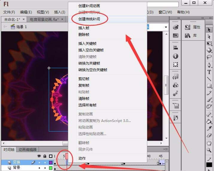 8、在時間軸的第1幀與第15幀之間右擊,選擇創建傳統補間選項,添加補間動畫。