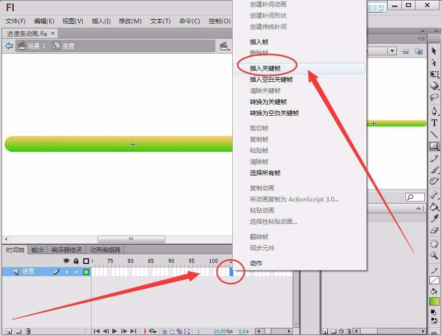 6、在圖層的100幀右擊,選擇“插入關鍵幀”,在100幀就有了一個與第一幀相同的圓頭矩形。