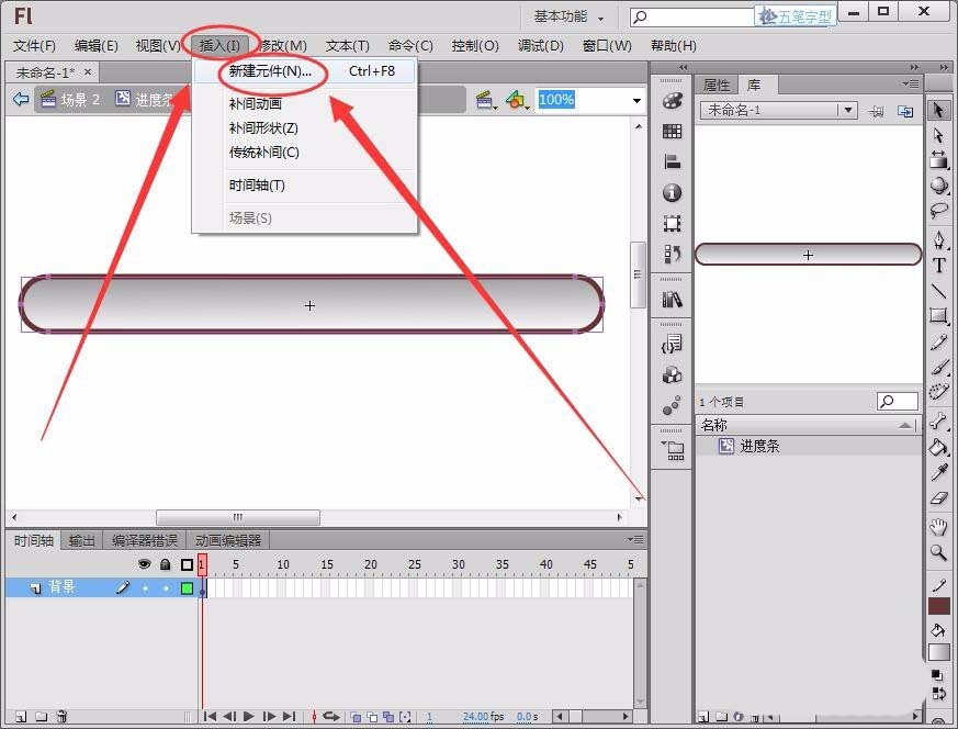 4、單擊“插入”---->“新建元件”,創建一個影片剪輯元件“進度”。