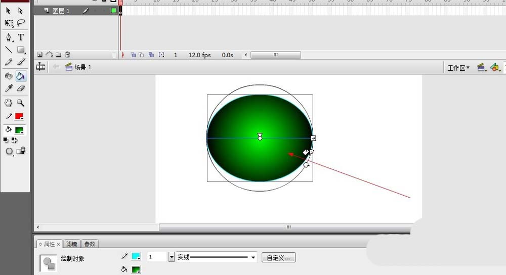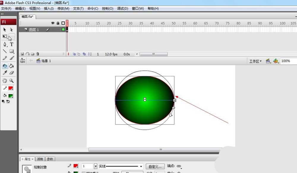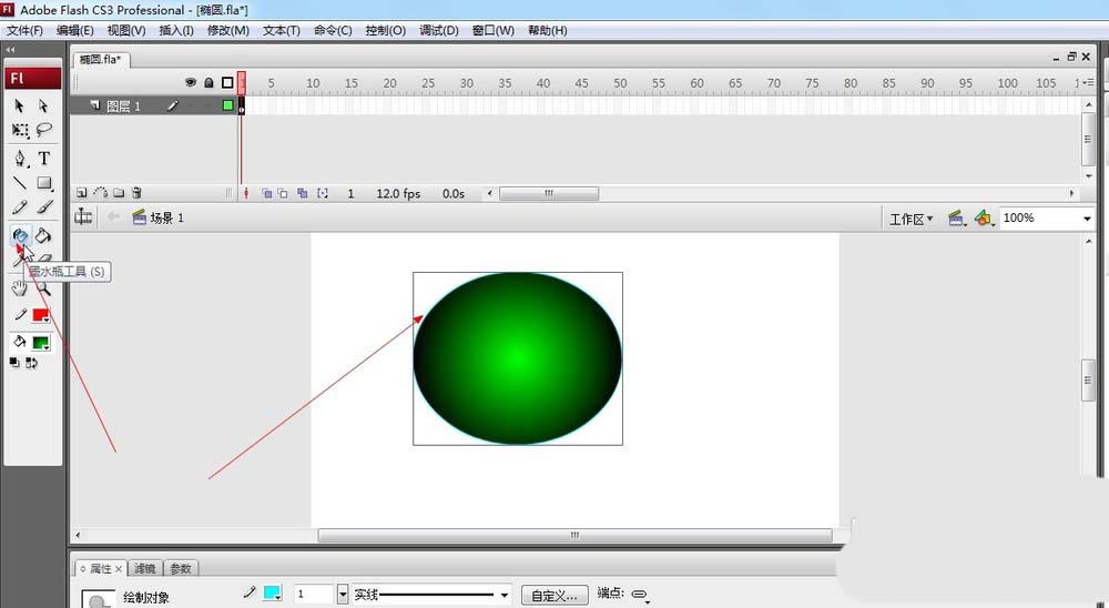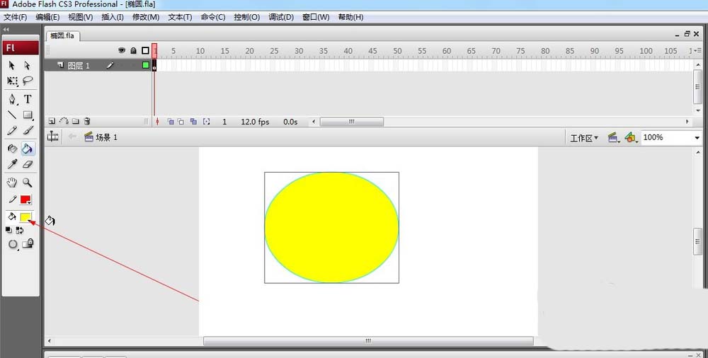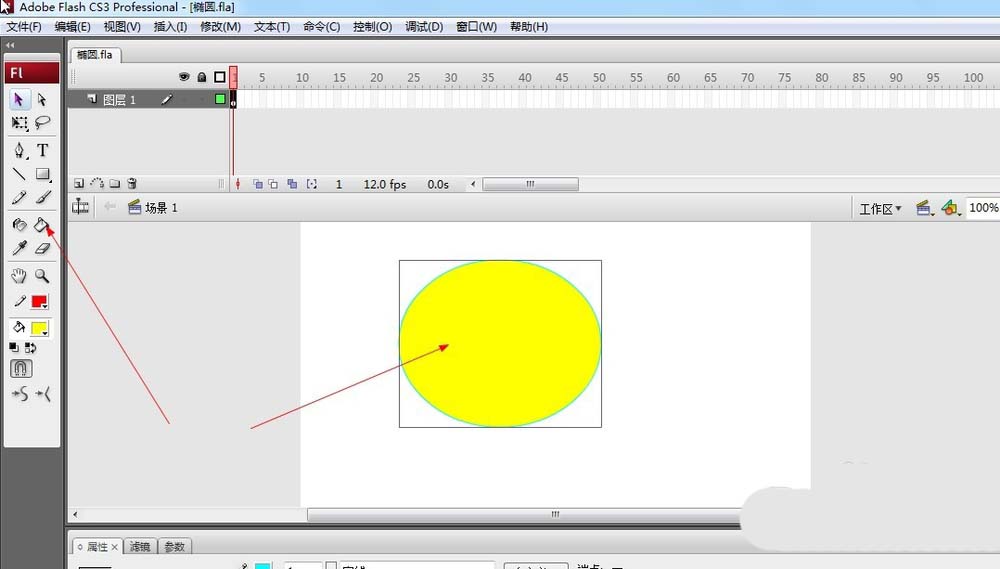 2、如圖所示,我們鼠標點擊一下這個橢圓,將這個橢圓進行選中,之后點擊箭頭所指的顏料桶工具,進行橢圓填充色的修改。