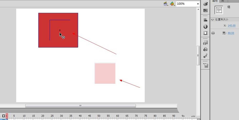 1、如圖所示,我們新建一個flash的文檔,之后我們點擊箭頭所指的矩形工具,之后用矩形工具繪制2個正方形。