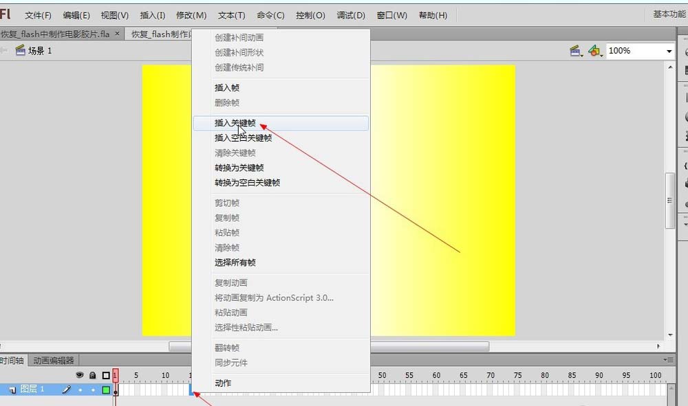 6、如圖所示,我們在這個第15幀處鼠標(biāo)右擊,在彈出的上啦列表菜單中,我們點(diǎn)擊箭頭所指的“插入關(guān)鍵幀”這一項(xiàng)。