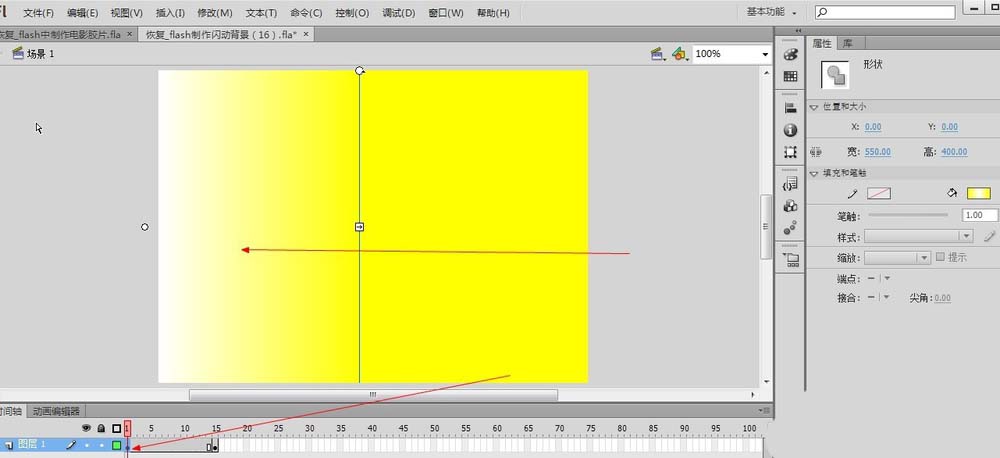 9、如圖所示,我們點(diǎn)擊選擇這個圖層的第1幀,之后依舊用這個漸變色變形工具,將這個漸變色進(jìn)行移動,移動白色部分到舞臺的左邊。
