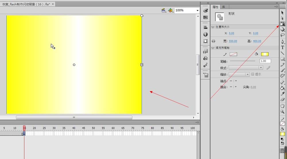 7、如圖所示,我們點(diǎn)擊選擇第15幀處,并且選擇這個矩形,然后點(diǎn)擊變形工具哪里的黑色小三角,在彈出的菜單中,我們點(diǎn)擊選擇哪個漸變色變形,就可以選擇漸變色變形工具了,之后再次點(diǎn)擊這個矩形,就可以直接選到這個矩形上面漸變色的部分了。