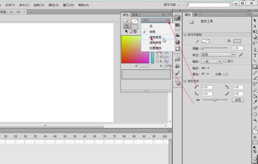 1、如圖所示,我們新建一個flash的文檔,之后我們點(diǎn)擊箭頭所指的矩形工具,之后點(diǎn)擊這個顏色按鈕,為這個矩形工具繪制的矩形選擇一個顏色。