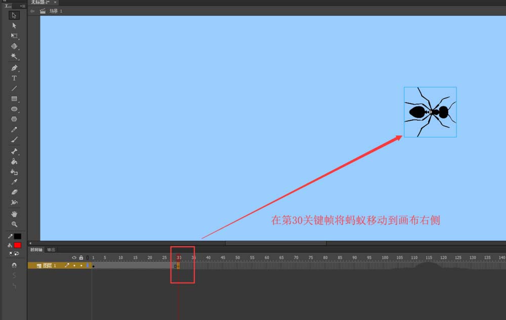 6、選中時間軸中的第30幀,然后在第30幀處插入一個關鍵幀;選擇創建的第30幀關鍵幀,用移動工具將螞蟻水平移動到畫布的右側。