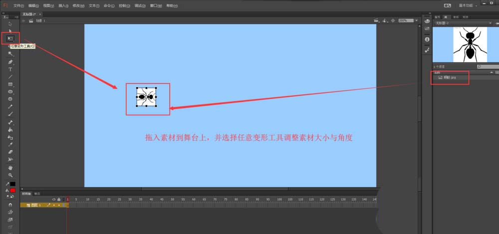 3、選中庫中的螞蟻素材,將其拖到舞臺上,并選擇任意變形工具調整位圖素材的大小與旋轉角度到合適。