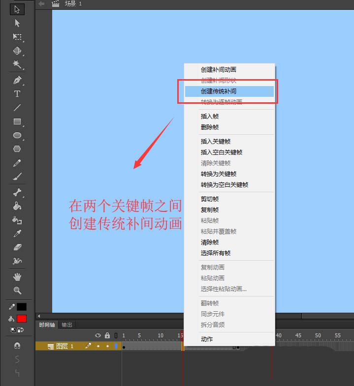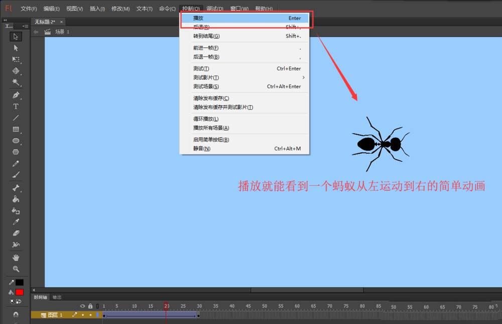 7、在時間軸的第1到30關鍵幀之間右鍵鼠標執行“創建傳統補間”,來創建一個傳統補間動畫。然后執行控制菜單欄中的播放命令,就能看到一個螞蟻從畫布左側運動到右側的簡單動畫出來了。