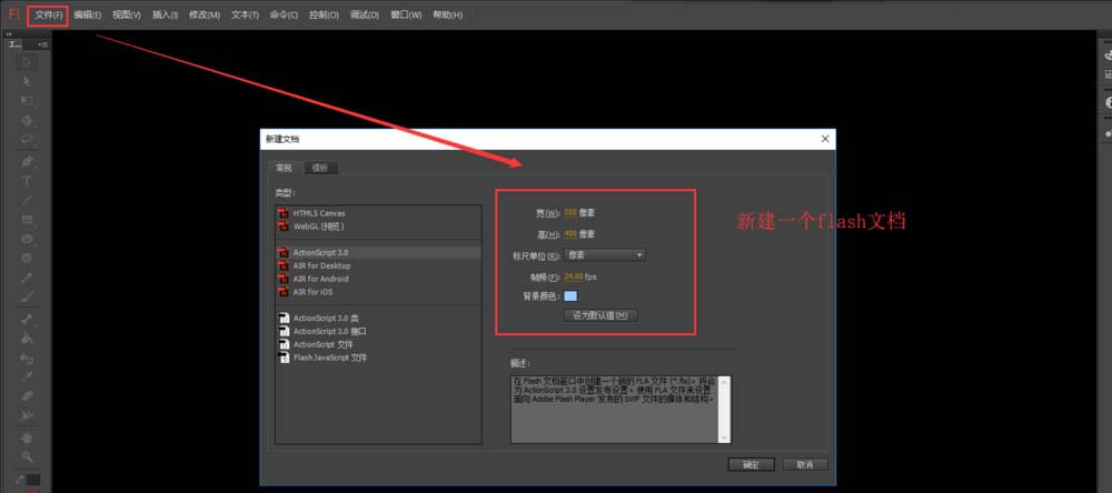1、打開flash,選擇文件中的新建項目,新建一個flash項目,設置這個flash項目的大小與背景顏色等參數確定創建。