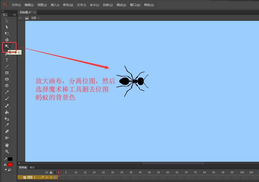 4、選中舞臺中的螞蟻位圖素材,按Ctrl+B將其分離,然后選擇魔術棒工具選擇螞蟻的背景顏色,將背景顏色刪除。
