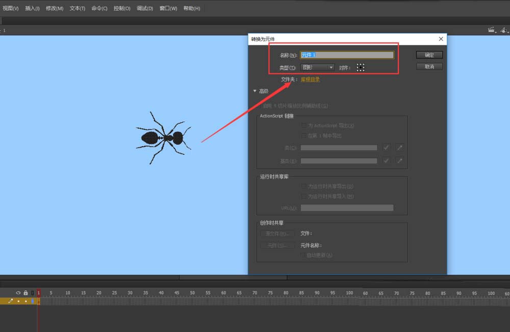 5、執行修改菜單欄中的“轉換為元件”,在彈出的轉換為元件窗口中選擇將分離刪除背景后的螞蟻轉換為一個圖形元件。