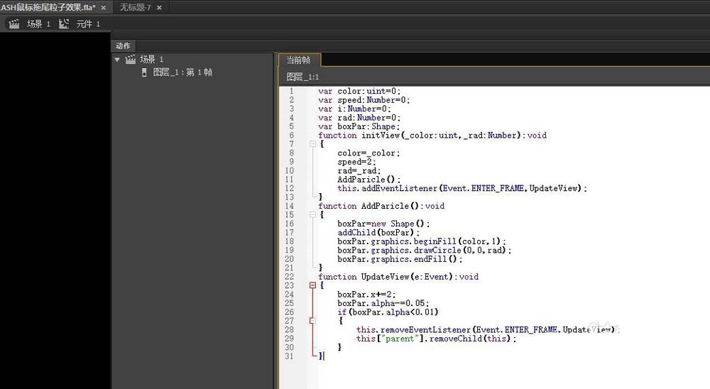 var color:uint=0;var speed:Number=0;var i:Number=0;var rad:Number=0;var boxPar:Shape;function initView(_color:uint,_rad:Number):void{color=_color;speed=2;rad=_rad;AddParicle();this.addEventListener(Event.ENTER_FRAME,UpdateView);}function AddParicle():void{boxPar=new Shape();addChild(boxPar);boxPar.graphics.beginFill(color,1);boxPar.graphics.drawCircle(0,0,rad);boxPar.graphics.endFill();}function UpdateView(e:Event):void{boxPar.x+=2;boxPar.alpha-=0.05;if(boxPar.alpha<0.01){this.removeEventListener(Event.ENTER_FRAME,UpdateView);this["parent"].removeChild(this);}}
