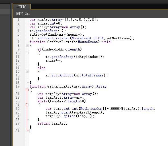var numAry:Array=[2,3,4,5,6,7,8];var index:int=0;var idAry:Array=new Array();mc.gotoAndStop(1);idAry=GetRandomAry(numAry);btn.addEventListener(MouseEvent.CLICK,GetNextFrame);function GetNextFrame(e:MouseEvent):void{if(index<idAry.length){mc.gotoAndStop(idAry[index]);index++;}else{mc.gotoAndStop(mc.totalFrames);}}function GetRandomAry(ary:Array):Array{var tempAry:Array=new Array();var tempAry2:Array=ary;while(tempAry2.length>0){var temp:int=int(Math.random()*10000)%tempAry2.length;tempAry.push(tempAry2[temp]);tempAry2.splice(temp,1);}return tempAry;}