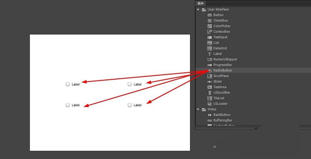 2、ctrl+f7打開(kāi)組件面板,并拖動(dòng)四個(gè)RadioButton組件到舞臺(tái)中。