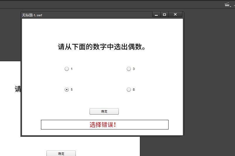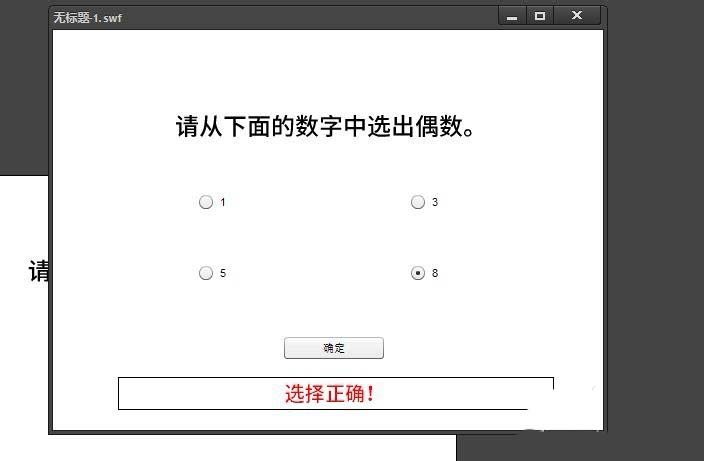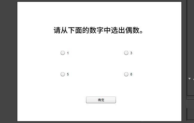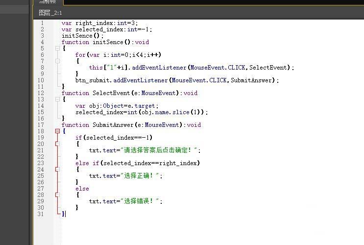 var right_index:int=3;var selected_index:int=-1;initSence();function initSence():void{for(var i:int=0;i<4;i++){this["l"+i].addEventListener(MouseEvent.CLICK,SelectEvent);}btn_submit.addEventListener(MouseEvent.CLICK,SubmitAnswer);}function SelectEvent(e:MouseEvent):void{var obj:Object=e.target;selected_index=int(obj.name.slice(1));}function SubmitAnswer(e:MouseEvent):void{if(selected_index==-1){txt.text="請(qǐng)選擇答案后點(diǎn)擊確定!";}else if(selected_index==right_index){txt.text="選擇正確!";}else{txt.text="選擇錯(cuò)誤!";}}