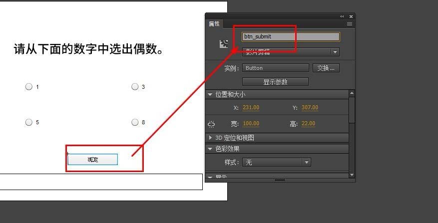 6、從組件面板中拖出一個(gè)Button做為確定答案的按鈕。設(shè)置實(shí)例名為btn_sumbit,設(shè)置Label參數(shù)為確定。