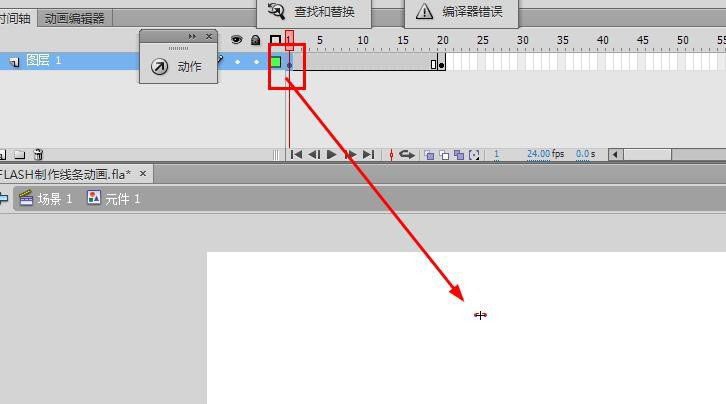 4、雙擊進入編輯狀態,延長幀到20幀,并添加關鍵幀。在第1幀,將直線長度調為10個像素,并居中。