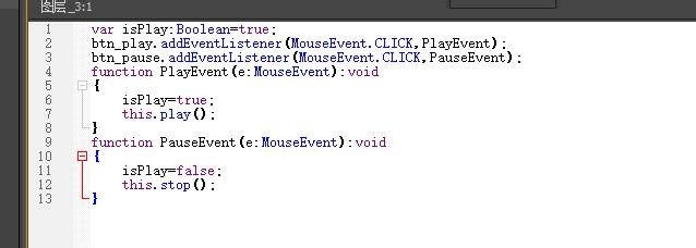 var isPlay:Boolean=true;btn_play.addEventListener(MouseEvent.CLICK,PlayEvent);btn_pause.addEventListener(MouseEvent.CLICK,PauseEvent);function PlayEvent(e:MouseEvent):void{isPlay=true;this.play();}function PauseEvent(e:MouseEvent):void{isPlay=false;this.stop();}