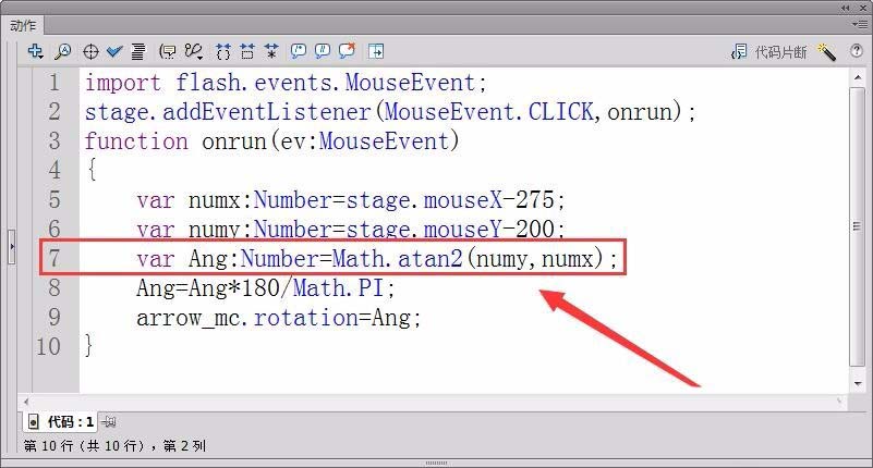 8、定義一個實型變量,保存鼠標相對于舞臺中心的角度值,用反正切函數Math.atan2計算角度值。