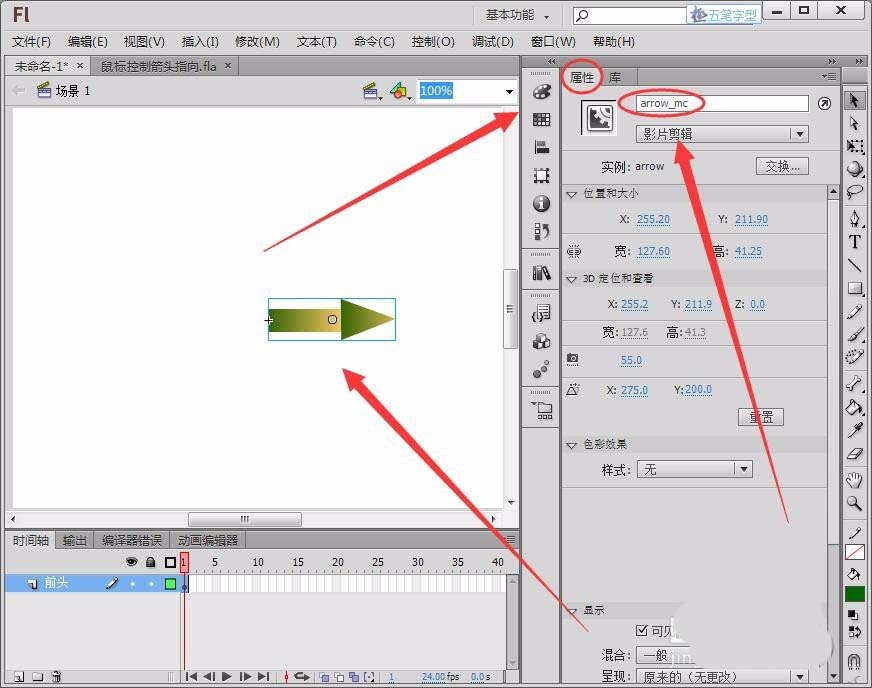 2、回到場景1,將庫面板中的影片剪輯元件arrow拖動到舞臺中,在“屬性”面板中,將實例名稱取名為“arrow_mc”。
