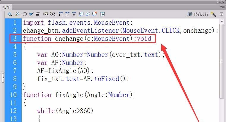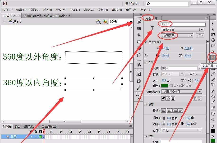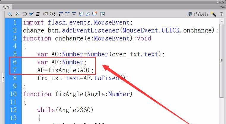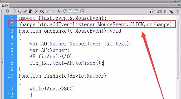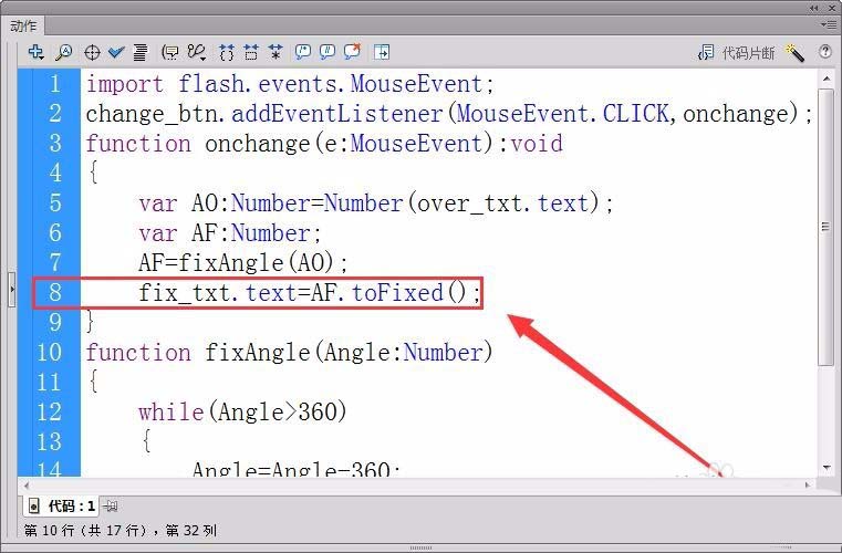8、接著,在舞臺輸出轉換后的角度,函數toFixed()實現四舍五入取整,用屬性fix_txt.text輸出角度值。