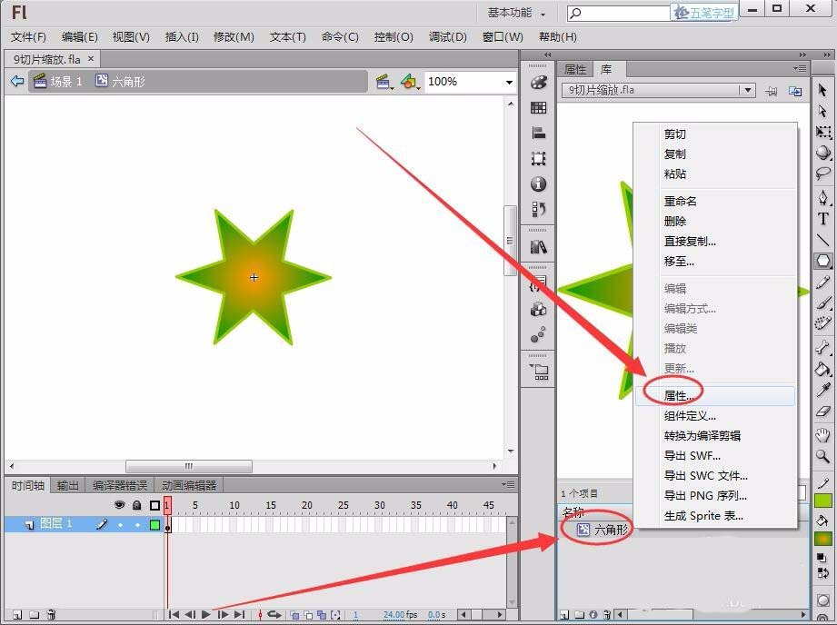 4、在庫面板中的“六角形”影片剪輯元件上右擊,選擇“屬性”選項。