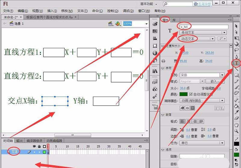 3、用“文本工具”在舞臺繪制2個動態文本框,用來輸出交點的X軸坐標和Y軸坐標,將實例名稱取名為“x_txt”和“y_txt”。