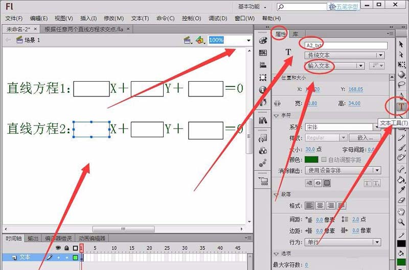 2、用上一步的方法,書寫直線2的方程,將3個輸入文本框的實例名稱取名為“A2_txt”、“B2_txt”和“C2_txt”。