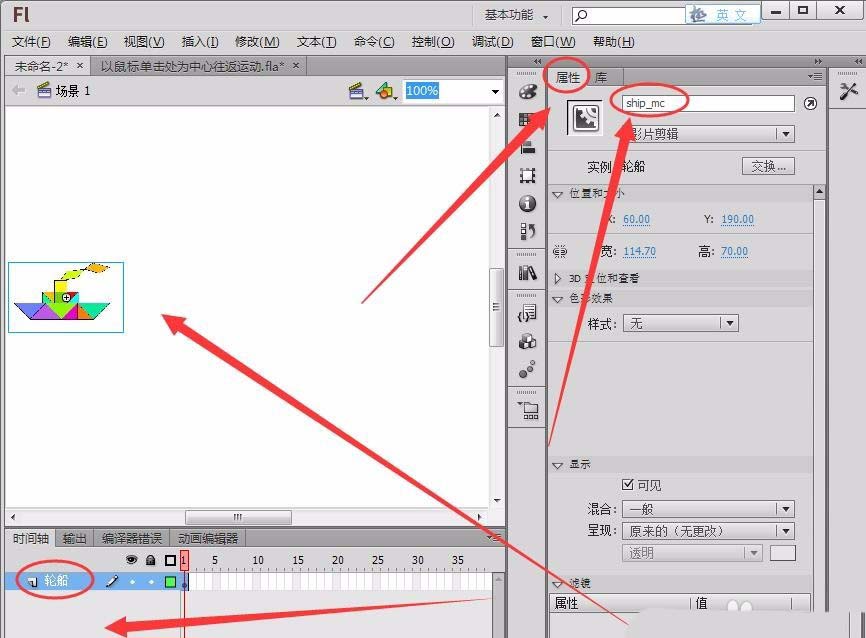 1、在舞臺中制作一個影片剪輯元件“輪船”,在屬性面板中,將實例名稱取名為“ship_mc”。