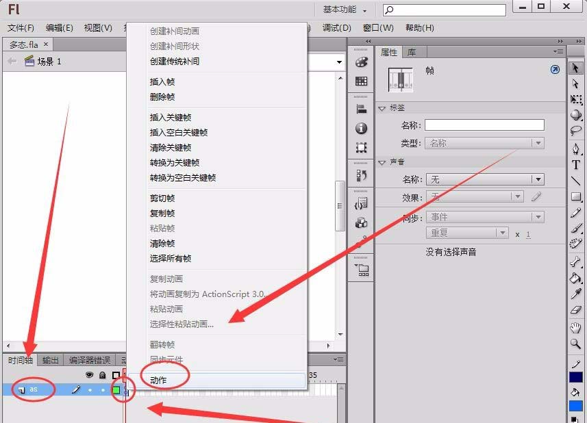 1、新建一個(gè)Flash文檔,將圖層1命名為as,在第1幀右擊,打開(kāi)動(dòng)作面板。