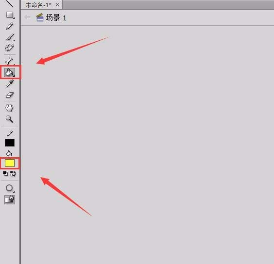 5、再在工具箱內找到顏料桶工具,將填充色設置為黃色,如圖所示: