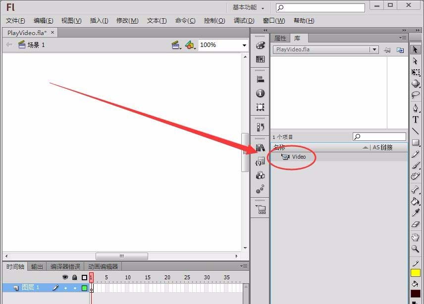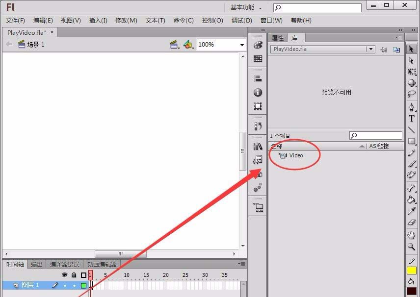 2、視頻文件就在庫面板中了,但按此方法新建的視頻,需要用ActionScript代碼控制,才能在Flash中播放視頻。