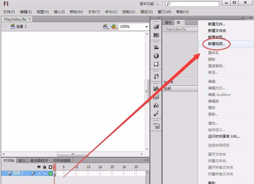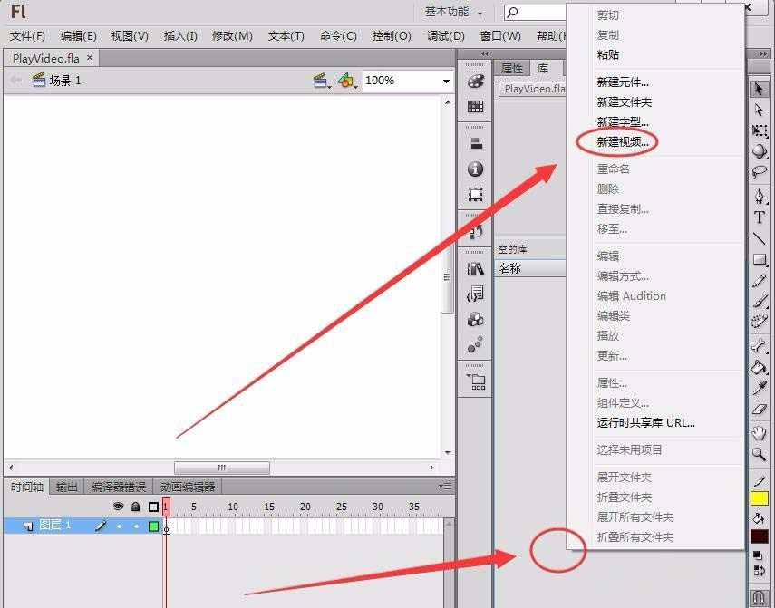 方法二:在庫面板的空白區(qū)域右擊,選擇“新建視頻”。