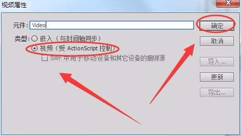 1、在“視頻屬性”窗口中,類型選擇“視頻(ActionScript控制)”,單擊“確定”。