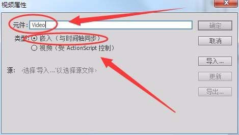 1、打開“視頻屬性”對話框后,在“元件”欄中輸入視頻的名稱,“類型”選擇為“嵌入”。
