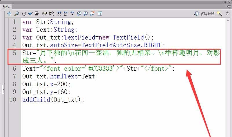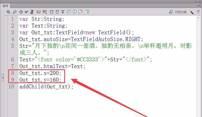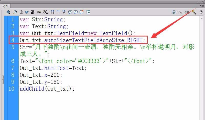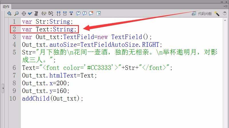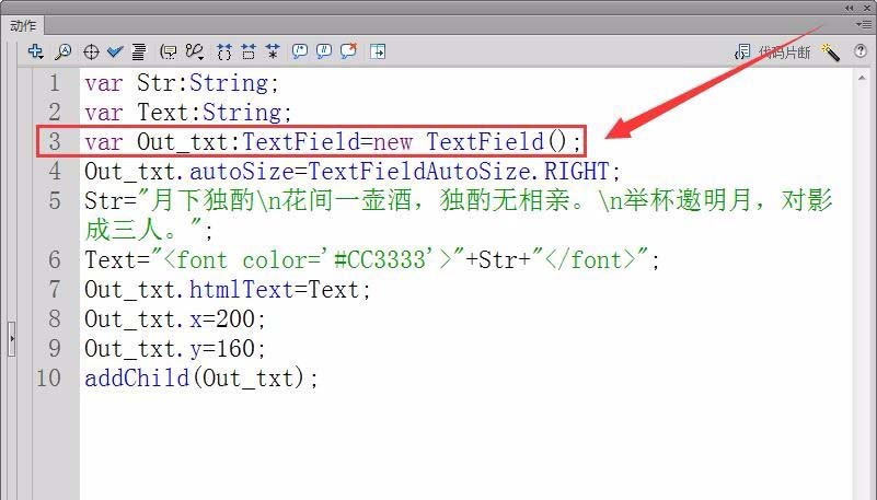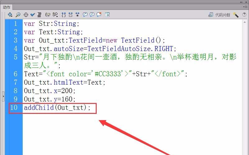 9、最后,將文本添加到顯示列表中,使它能在舞臺(tái)正常顯示。