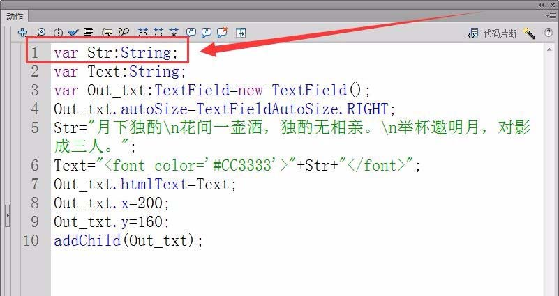 1、創(chuàng)建一個(gè)Flash文檔,打開動(dòng)作面板。首先,定義一個(gè)字符串變量Str,用來保存輸出的文本。