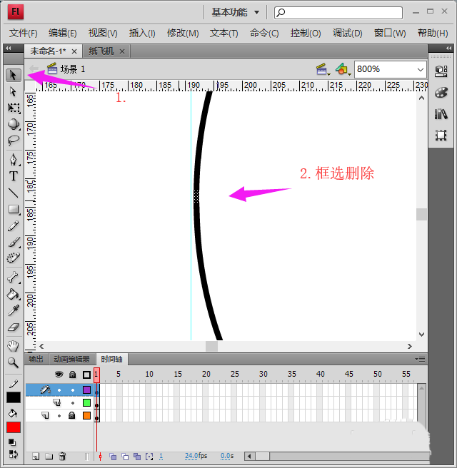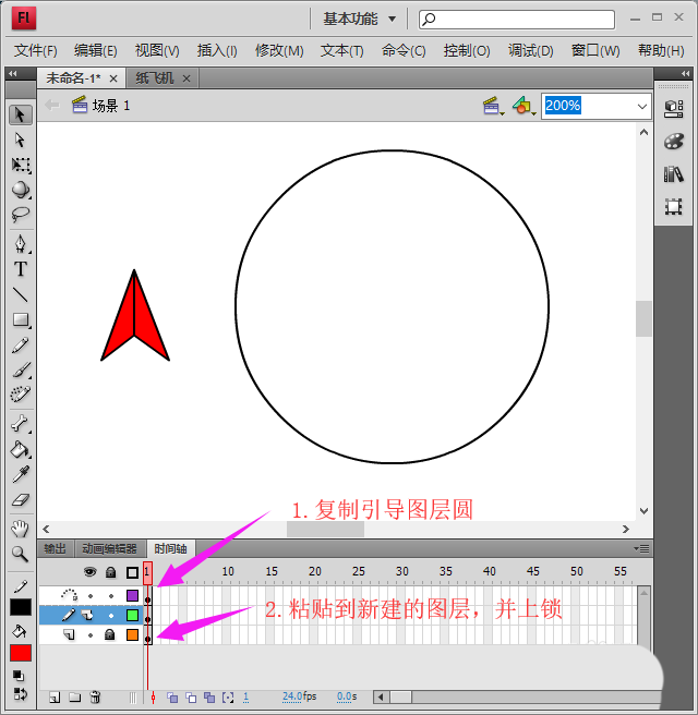 4、紙飛機繪制好了后,我們再新建一個圖層,將引導層的圓復制到該圖層上,因為引導層繪制的圖形是不可見的,如圖所示