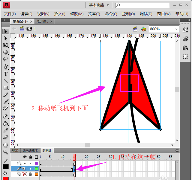 7、然后,我們在15幀位置,按F6,其他圖層按F5,接著,移動紙飛機到缺口的下一部分,如圖所示