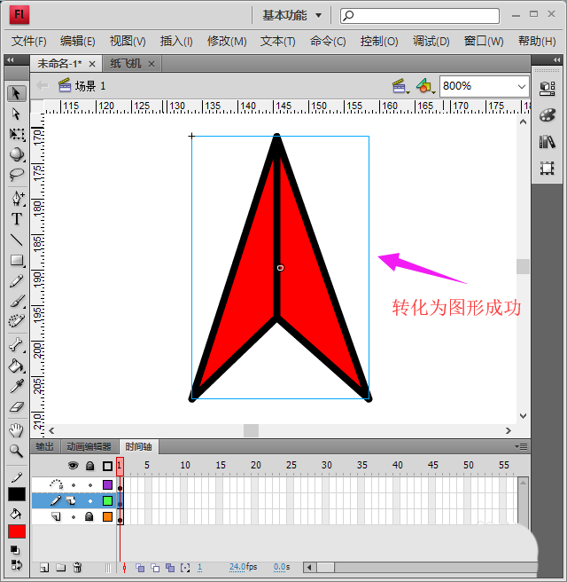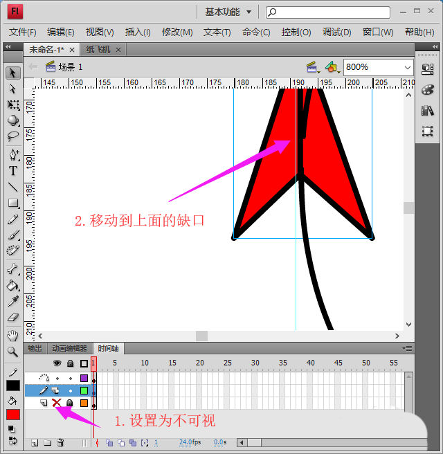 6、接著,回到被引導層,將紙飛機按F8鍵轉化為圖形,并移動到缺口的上部分,注意將新建的圖層設為不可視,如圖所示