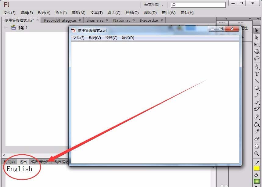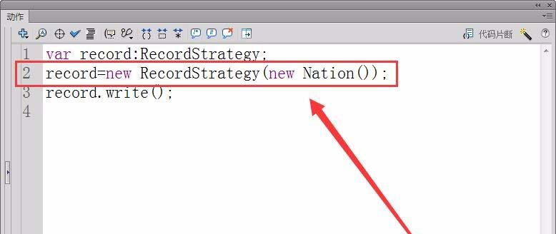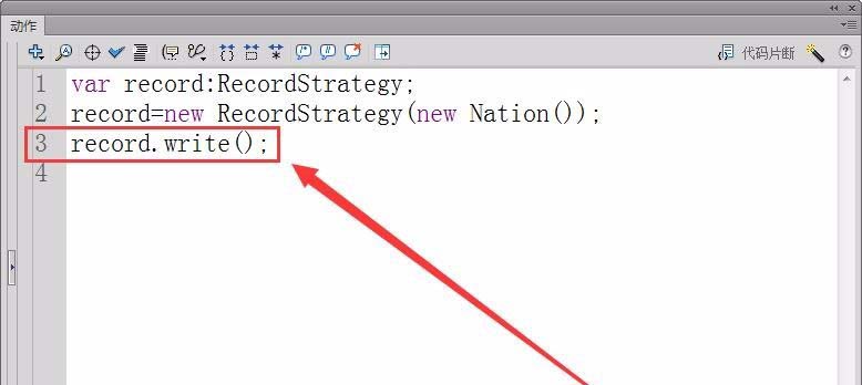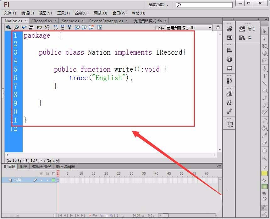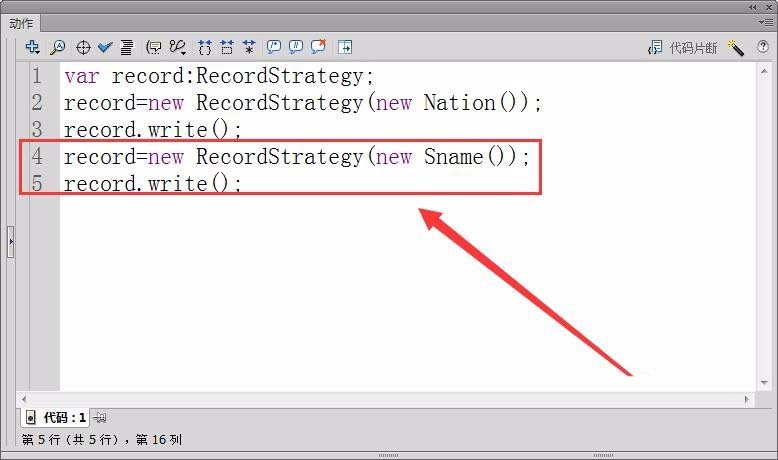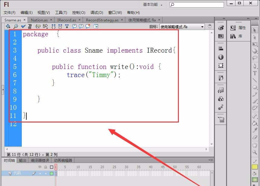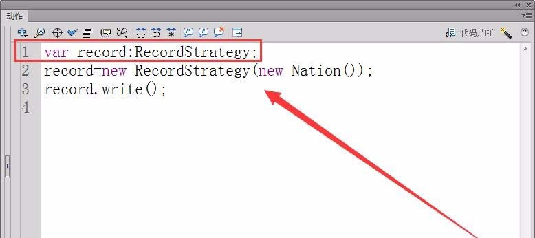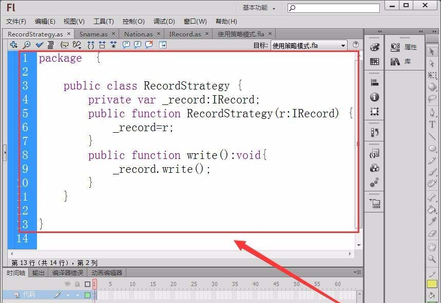 6、新建一個(gè)Flash文檔,具體使用策略模式。文檔中先定義一個(gè)變量record,類型為RecordStrategy。