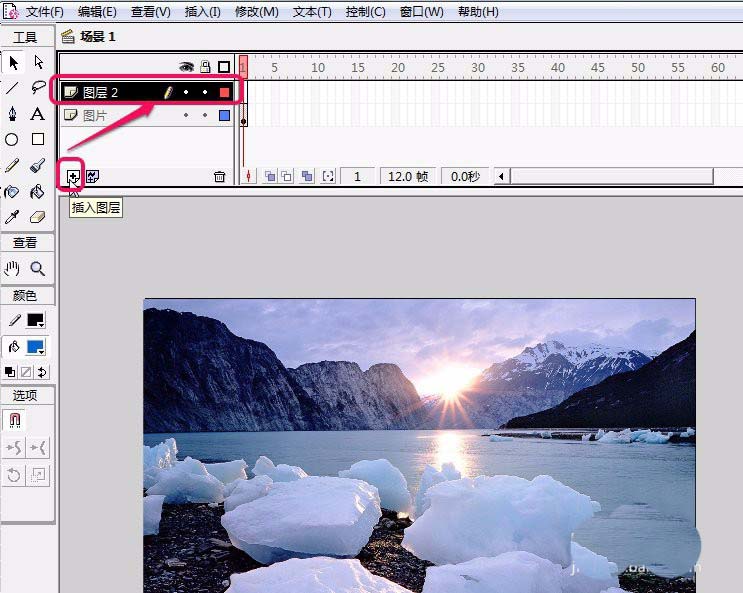 4、單擊“插入圖層”按鈕在“圖片”圖層上面插入“圖層 2”圖層,并且重命名為“矩形遮蔽”。