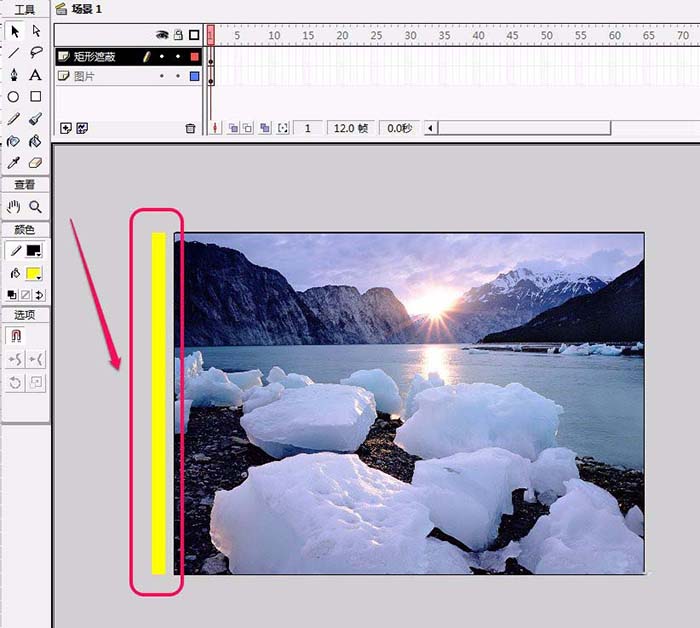 5、在“矩形遮蔽”圖層繪制一個矩形。縮小矩形大小,并且把矩形放置在舞臺左側外部區域。