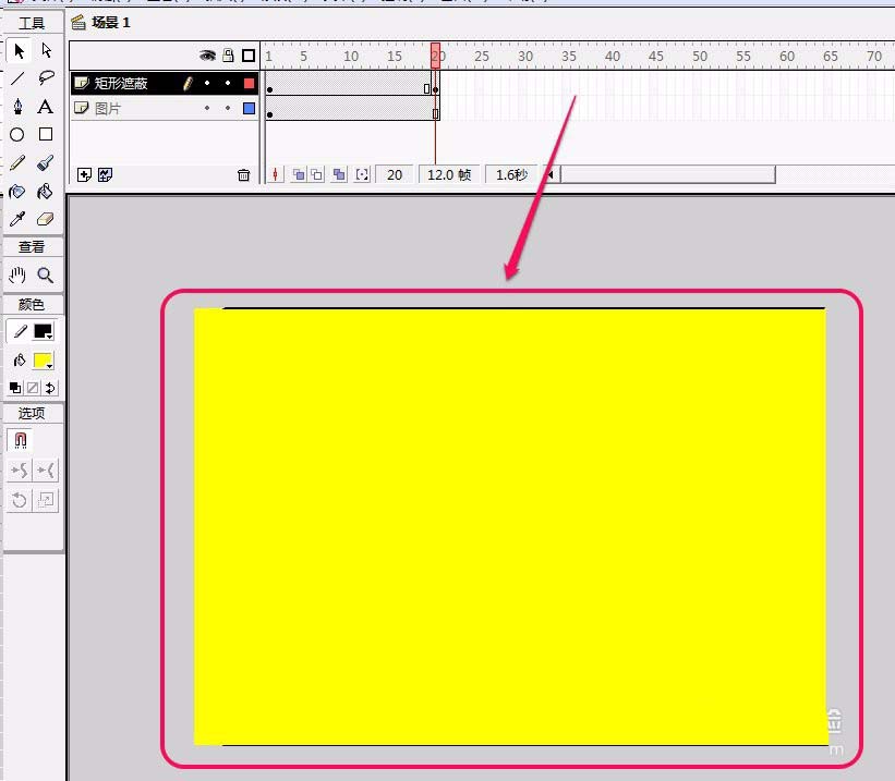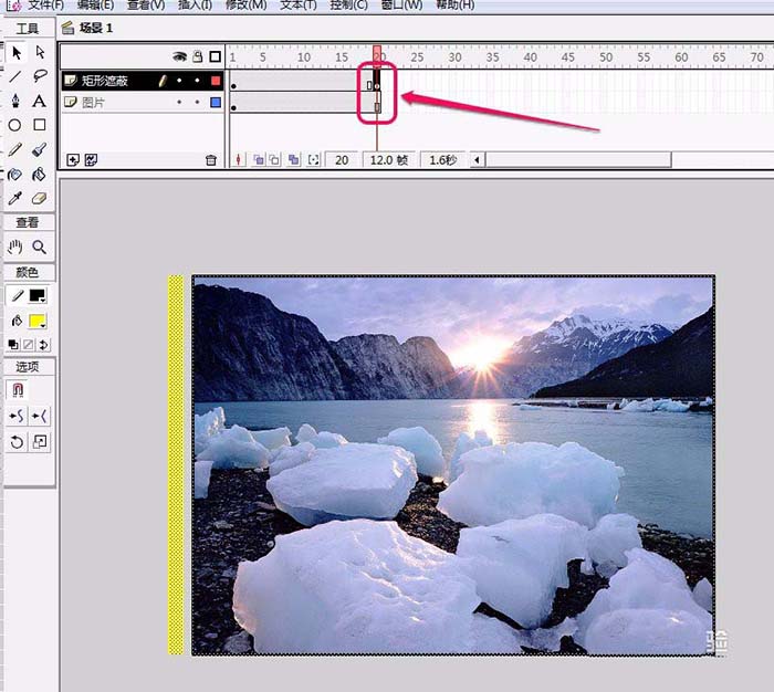 6、在“圖片”圖層第20幀插入普通幀;在“矩形遮蔽”圖層第20幀插入關鍵幀。